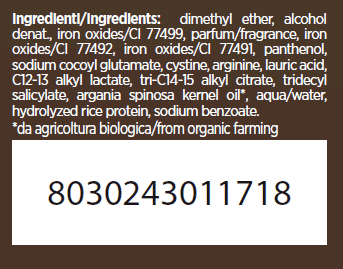 Dimethyl ether, alcohol denat., ci 77891 (titanium dioxide), ci 77492 (iron oxides), parfum (fragrance), panthenol, ci 77499 (iron oxides), ci 77491 (iron oxides), cystine, sodium cocoyl glutamate, arginine, lauric acid, c12-13 alkyl lactate, tri-c14-15 alkyl citrate, tridecyl salicylate, argania spinosa kernel oil, aqua (water), hydrolyzed rice protein, sodium benzoate