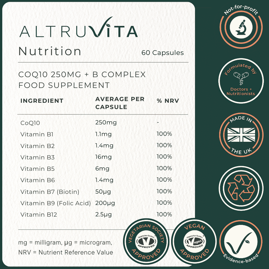 AltruVita’s CoQ10 supplement + B Complex contains a high dose of CoQ10 (250mg ubiquinone) and 100% NRV (Nutrient Reference Value) of all the 9 B-vitamins which are required for energy, a healthy nervous system, psychological function and immunity.