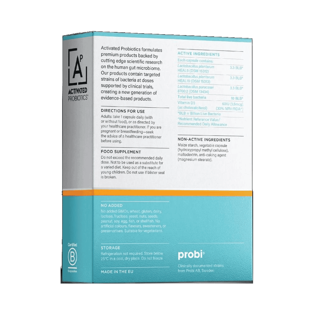 Lactobacillus plantarum HEAL9 (DSM 15312), Lactobacillus plantarum HEAL19 (DSM 15313), Lactobacillus paracasei 8700:2 (DSM 13434), vegetable capsule (Hydroxypropyl methylcellulose), magnesium stearate, maize starch, maize maltodextrin, Vitamin D3 (as cholecalciferol)