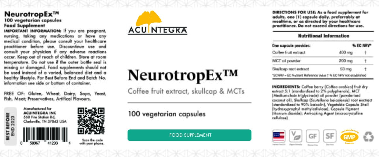 NeurotropEx is a plant-based formula created to support memory and cognition. Based on whole coffee fruit and skullcap extracts together with MCT, it aims to contribute to the good functioning of many processes crucial to support cerebral health.