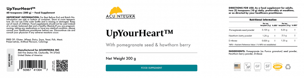 An evidenced-based, practitioner-formulated combination of superior grade pomegranate, hawthorn berry and d-ribose powders. The ingredients contribute to the good functioning of the cardiovascular system.