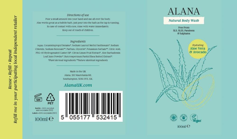 Natural Body Wash Hydrating Aloe Vera & Avocado 100ml (Travel Size)