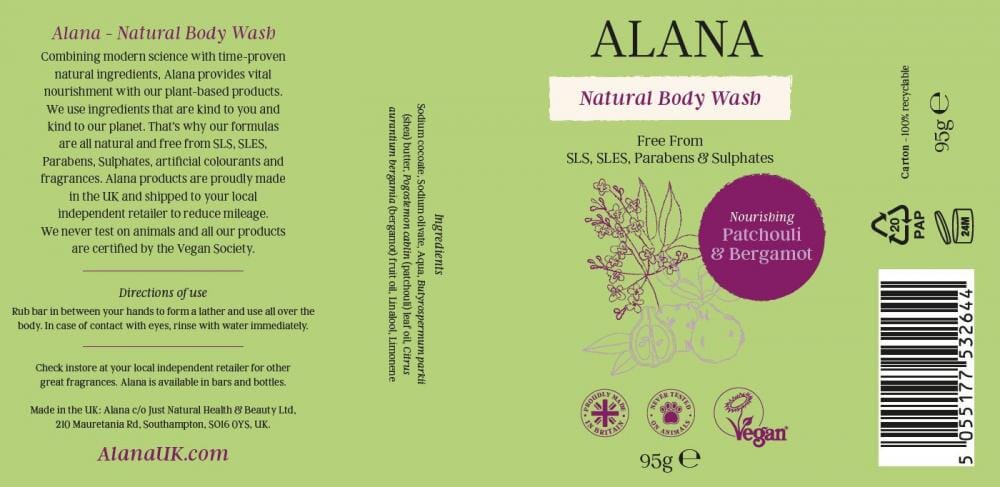 Alana is formulated with natural ingredients and free from SLS, SLES, parabens, sulphates, and artificial fragrances and colourants. The body wash, shampoo and conditioner bars are 100% plastic free, never tested on animals and they are all certified by the Vegan Society.