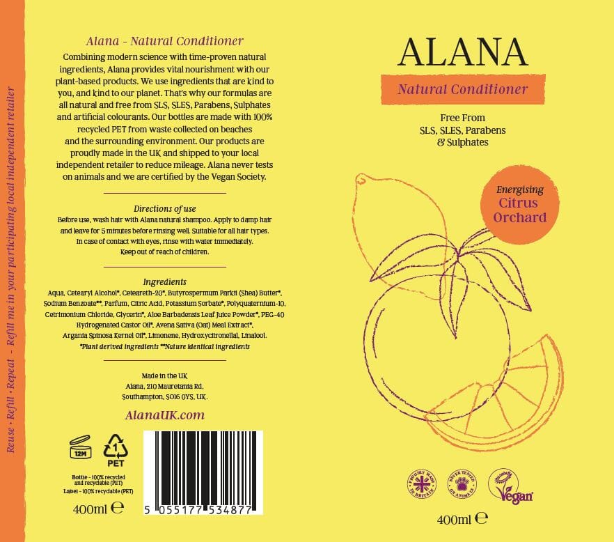 Alana is formulated with all natural and free from SLS, SLES, Parabens, Sulphates and artificial colourants. The bottles are made with 100% recycled PET from waste collected on beaches and the surrounding environment. Alana never tests on animals and they are certified by the Vegan Society.