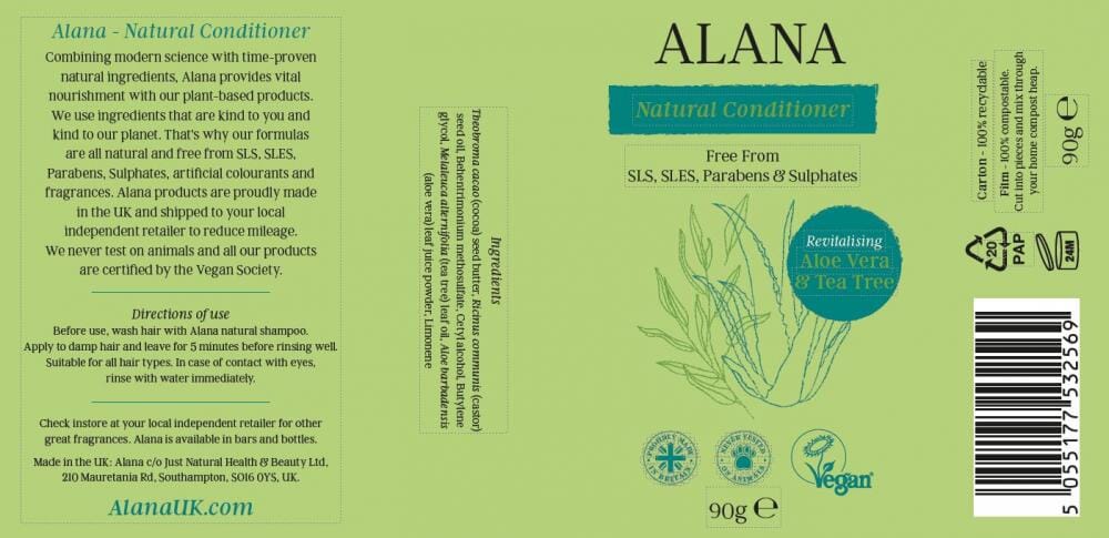 Alana is formulated with natural ingredients and free from SLS, SLES, parabens, sulphates, and artificial fragrances and colourants. The body wash, shampoo and conditioner bars are 100% plastic free, never tested on animals and they are all certified by the Vegan Society.