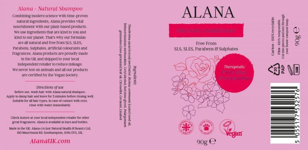 Alana is formulated with natural ingredients and free from SLS, SLES, parabens, sulphates, and artificial fragrances and colourants. The body wash, shampoo and conditioner bars are 100% plastic free, never tested on animals and they are all certified by the Vegan Society.