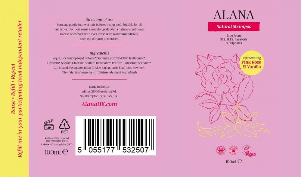 Alana is formulated with natural ingredients & free from SLS, SLES, parabens, sulphates & artificial colourants. These bottles are made with 100% recycled PET from waste collected on beaches & the surrounding environment. Alana never tests on animals & they are certified by the Vegan Society.