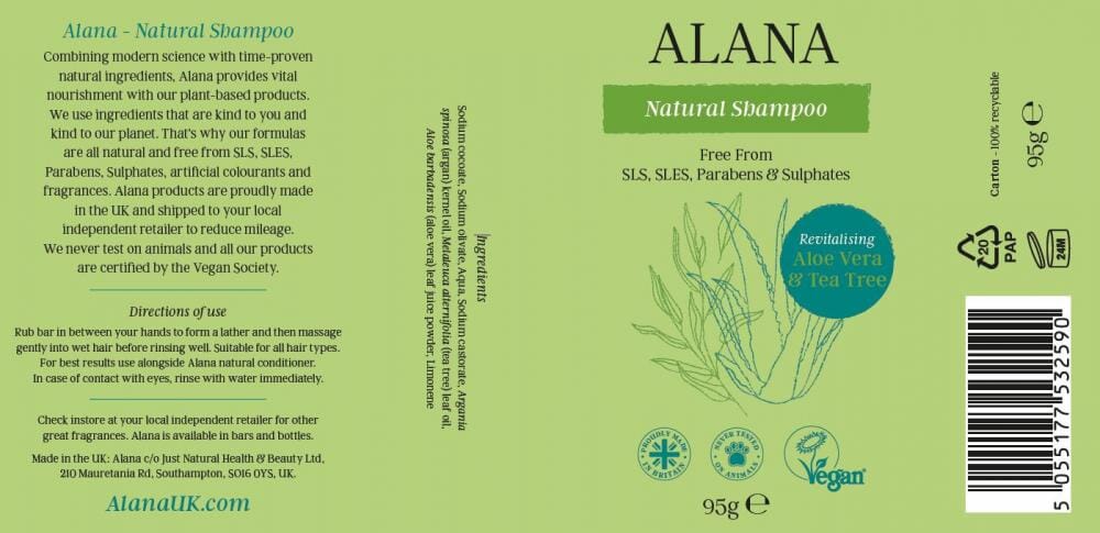 Alana is formulated with natural ingredients and free from SLS, SLES, parabens, sulphates, and artificial fragrances and colourants. The body wash, shampoo and conditioner bars are 100% plastic free, never tested on animals and they are all certified by the Vegan Society.