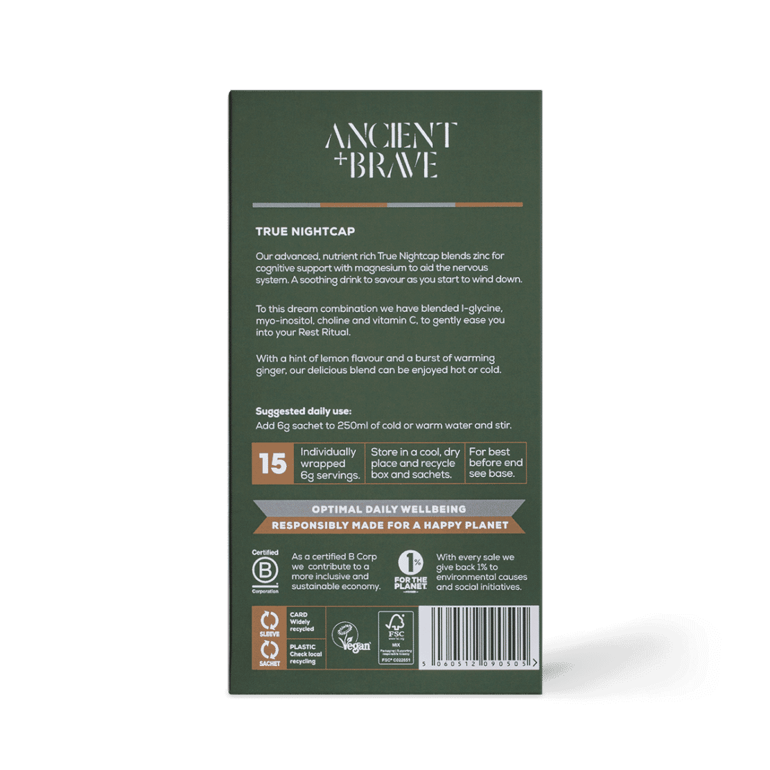 Ancient and Brave's advanced, nutrient rich True Nightcap provides a carefully curated selection of essential nutrients which support the body from neurotransmitters to nervous system, designed to promote a rejuvenating restful sleep.
