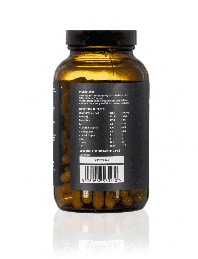 Grass-Fed Beef Testicle (50%), Grass-Fed Beef Liver (50%), Gelatine (Capsule)