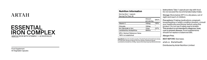 Iron supports red blood cell formation, oxygen transport, energy, immunity, cognition, and pregnancy. Artah's Essential Iron Complex uses gentle, bioavailable iron with vitamin C and acidophilus to enhance absorption and effectiveness.