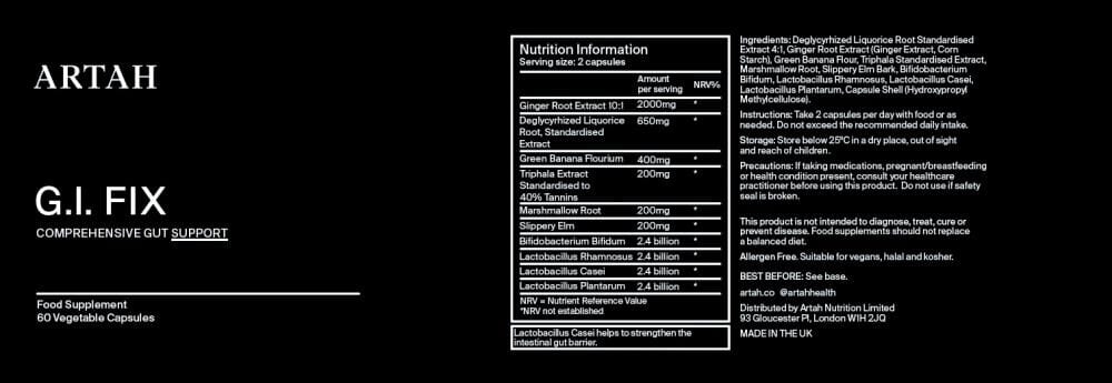 Triphala, Deglycyrrhizinated Licorice Root, Green Banana Flour, Marshmallow Root, Slippery Elm, Ginger Root, Bifidobacterium Bifidum, Lactobacillus Rhamnosus, Lactobacillus Casei, Lactobacillus Plantarum, capsule shell: hydroxypropylmethylcellulose