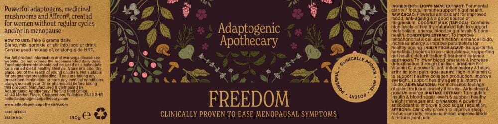 Adaptogenic natural support for women who don’t have regular cycles anymore and, or are in menopause. Freedom can be taken instead of or alongside HRT and contains adaptogens, mushrooms and Affron® to support the hormones.