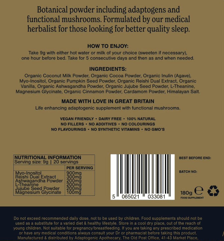Organic Coconut Milk Powder, Organic Cocoa Powder, Organic Inulin (Agave), Myo-Inositol, Organic Pumpkin Seed Powder, Organic Reishi Dual Extract, Organic Vanilla, Organic Ashwagandha Powder, Organic Jujube Seed Powder, L-Theanine, Magnesium Glycinate, Organic Cinnamon Powder, Cardamom Powder, Himalayan Salt