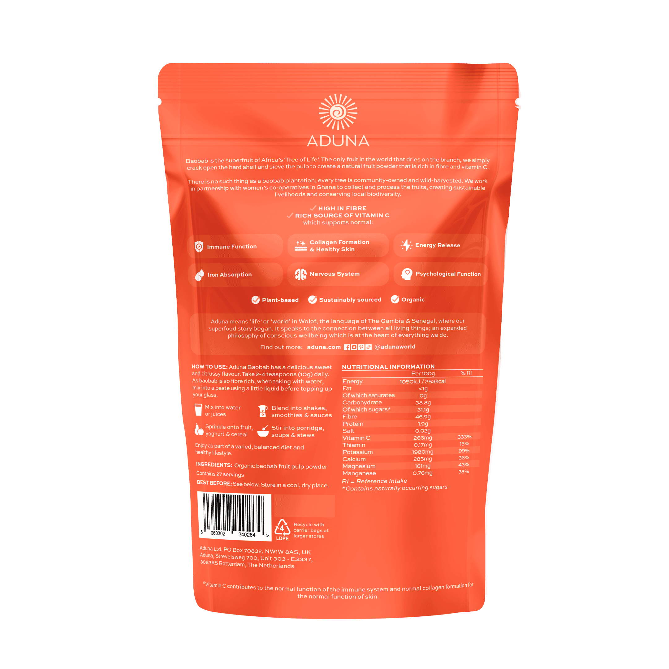 Find your natural zing, straight from the tree of life. Baobab is one of the only fruits to dry naturally on the branch – locking in vitamin C, fibre and antioxidants that support energy, skin health, immunity and your all-important gut microbiome. Stir into smoothies, juice or spoon over oats.