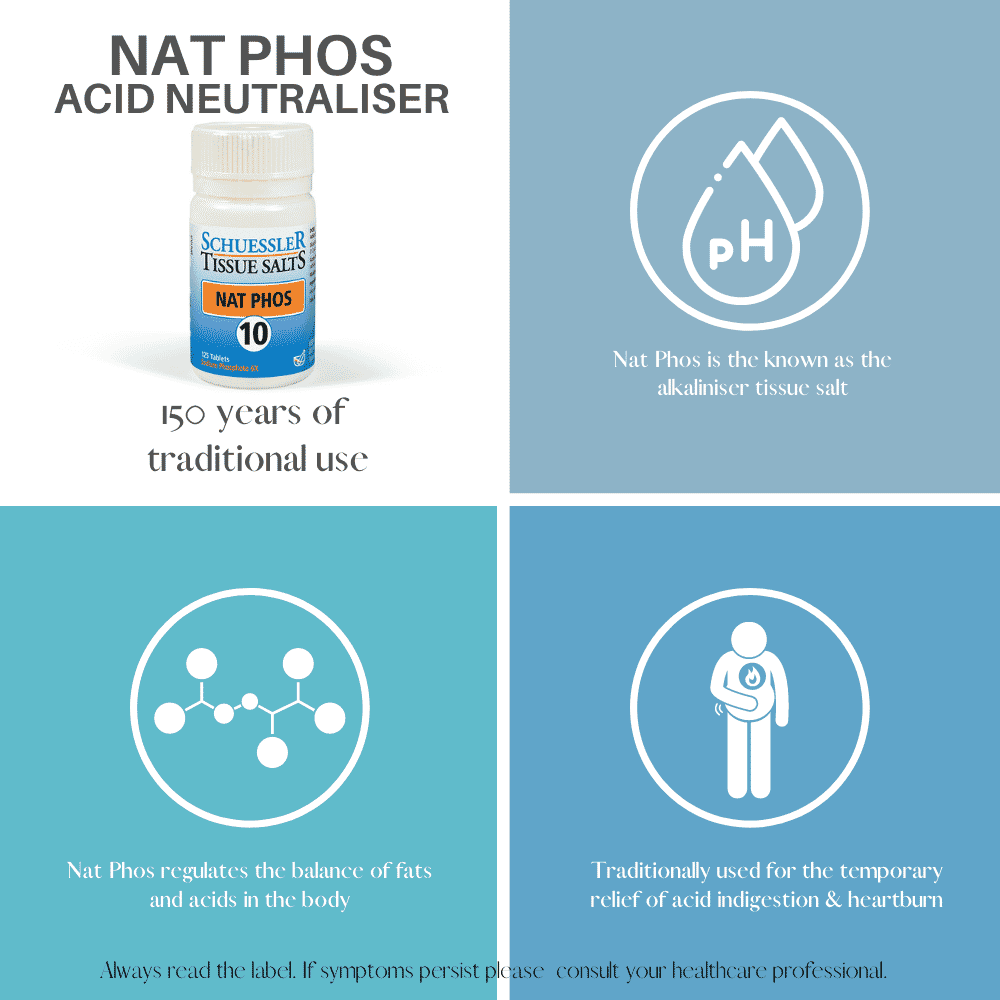 Nat Phos is the acid neutralising tissue salt and is present in the blood, muscles, nerve and brain cells. It is used in conditions of excess acidity which are characteristically sour smelling. This salt supports the balance of fats and acids in the body at all times.