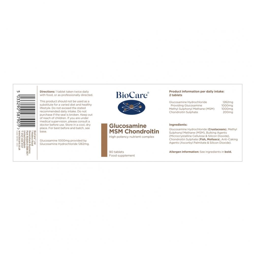 Glucosamine Hydrochloride (Crustaceans), Methyl Sulphonyl Methane (MSM), Bulking Agents (Microcrystalline Cellulose & Silicon Dioxide), Chondroitin Sulphate (Fish, Molluscs), Anti-Caking Agents (Ascorbyl Palmitate & Silicon Dioxide).