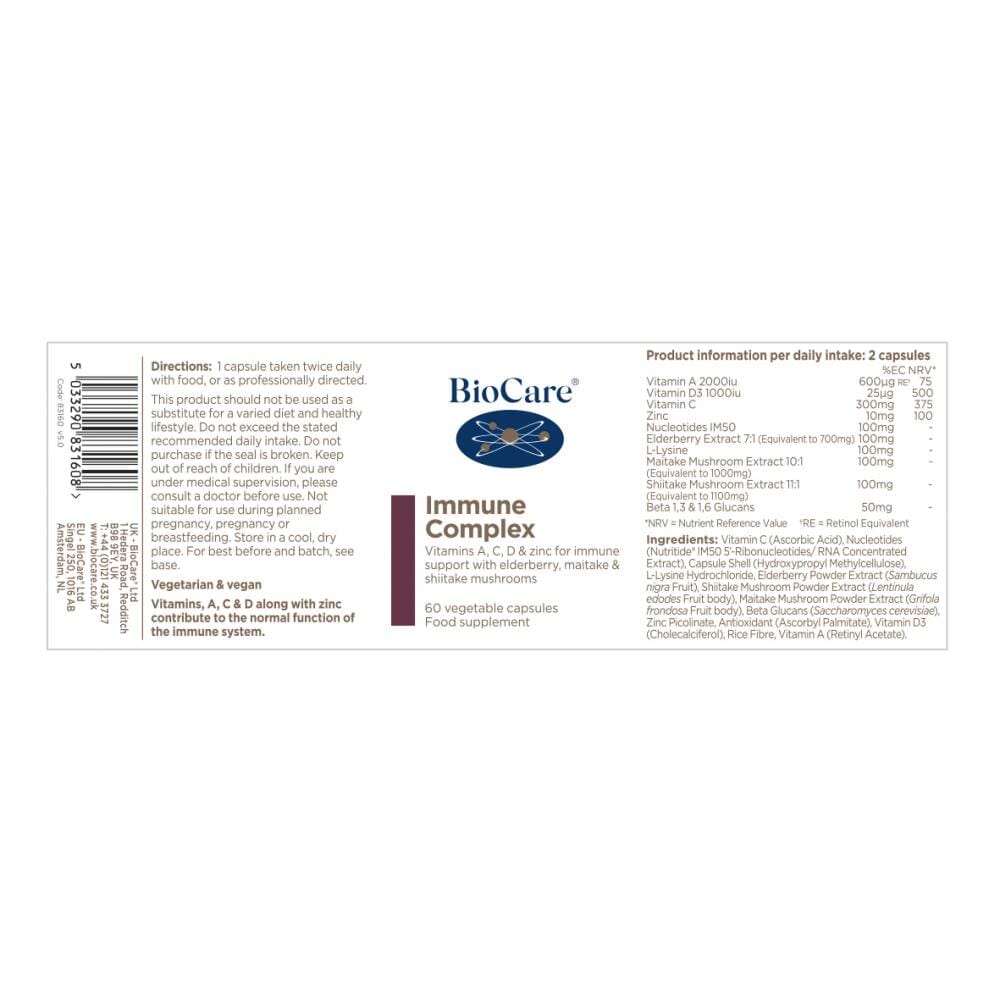 Immune Complex is a synergistic blend of nutrients and botanicals including vitamins A, C, D, zinc and elderberry for everyday immune support, alongside beta glucans, lysine and maitake and shiitake mushrooms.