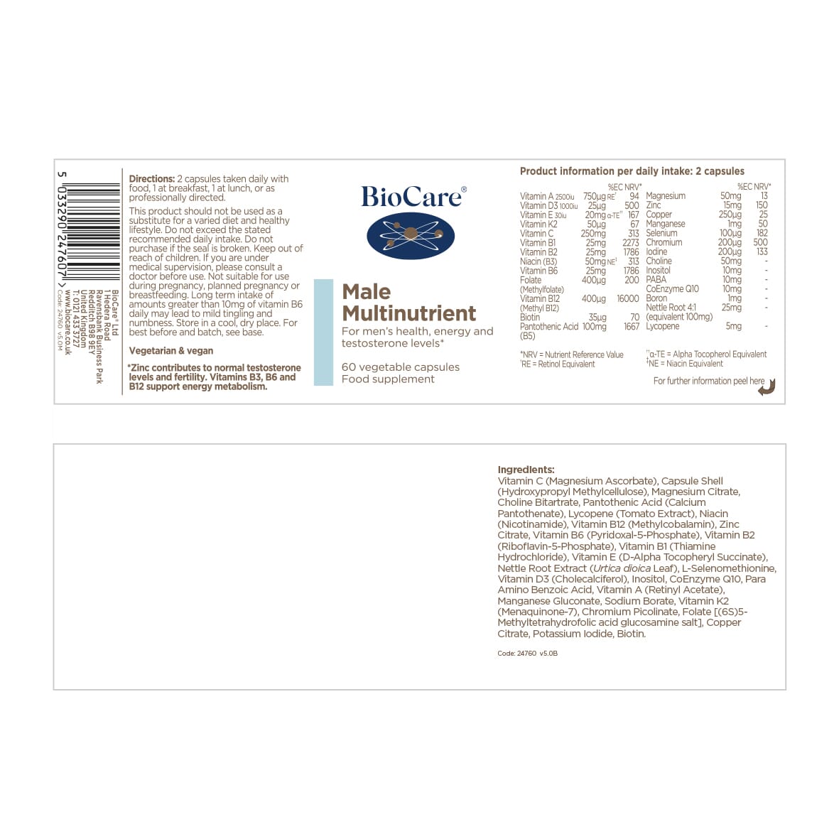 Male Multinutrient is an advance, high potency multinutrient for men's health containing Zinc to support testosterone levels, and B vitamins to support energy, with lycopene, and nettle root