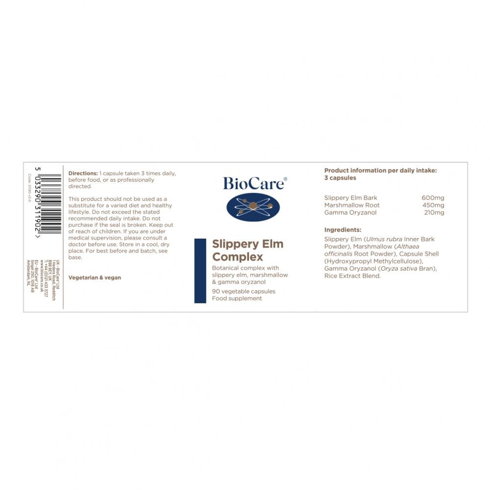 Slippery Elm Complex is a unique combination of nutrients including slippery elm and marshmallow to support and soothe the digestive system, with gamma oryzanol.