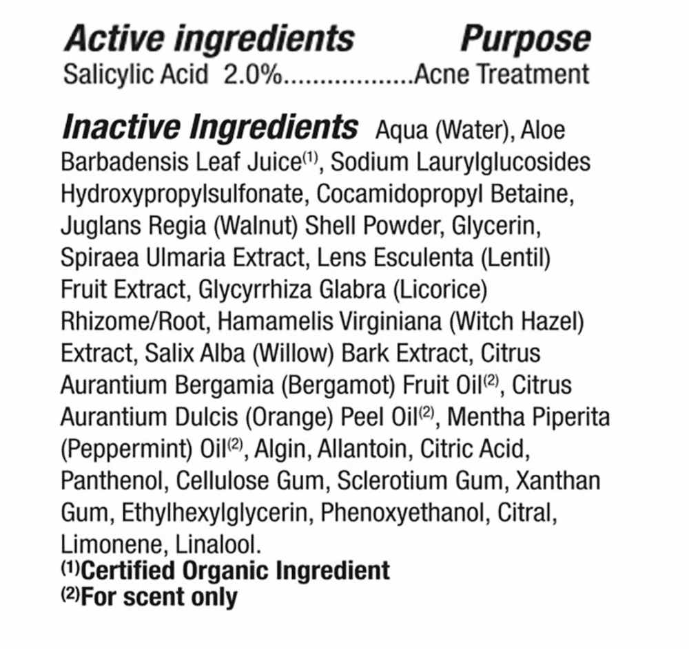 Active Ingredients: Salicylic Acid 2.0%, Inactive Ingredients: Aqua (Water), Aloe Barbadensis Leaf Juice (1), Sodium Laurylglucosides Hydroxypropylsulfonate, Cocamidopropyl Betaine, Juglans Regia (Walnut) Shell Powder, Glycerin, Spiraea Ulmaria Extract, Lens Esculenta (Lentil) Fruit Extract, Glycyrrhiza Glabra (Licorice) Rhizome/Root, Hamamelis Virginiana (Witch Hazel) Extract, Salix Alba (Willow) Bark Extract, Citrus Aurantium Bergamia (Bergamot) Fruit Oil (2), Citrus Aurantium Dulcis (Orange) Peel Oil (2), Mentha Piperita (Peppermint) Oil (2), Algin, Allantoin, Citric Acid, Panthenol, Cellulose Gum, Sclerotium Gum, Xanthan Gum, Ethylhexylglycerin, Phenoxyethanol, Citral, Limonene, Linalool.