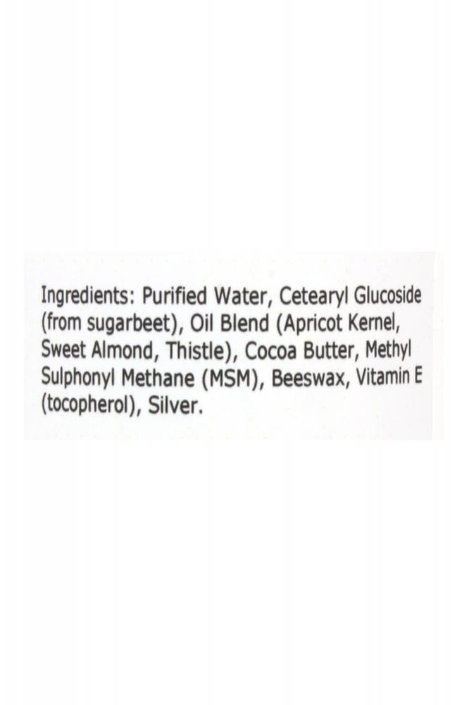 Steam-Distilled Water, Proprietary Blend of Cold-Pressed Oils (Apricot Kernel, Sweet Almond, Thistle), Cetearyl Glucoside (from Sugar Beet), Cocoa Butter, Beeswax, MSM, Vitamin E (tocopherol), Silver.